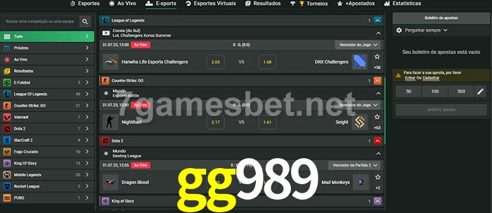 O gg989 oferece uma grande seleção de opções de apostas em e-sports com probabilidades competitivas